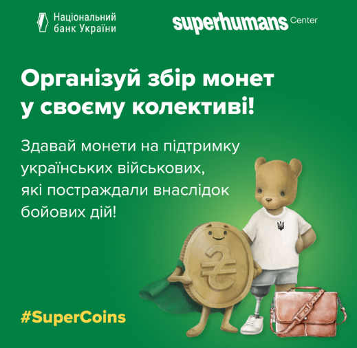 Сьогодні стартує благодійна акція зі збору монет #SuperCoins, організована Національним банком України та Superhumans Center. ЇЇ мета – зібрати кошти для допомоги українським військовим, які постраждали внаслідок бойових дій. У